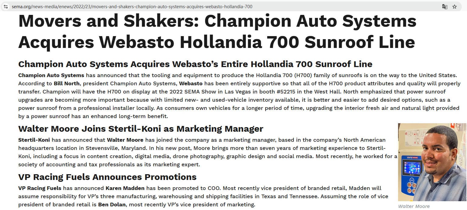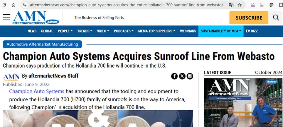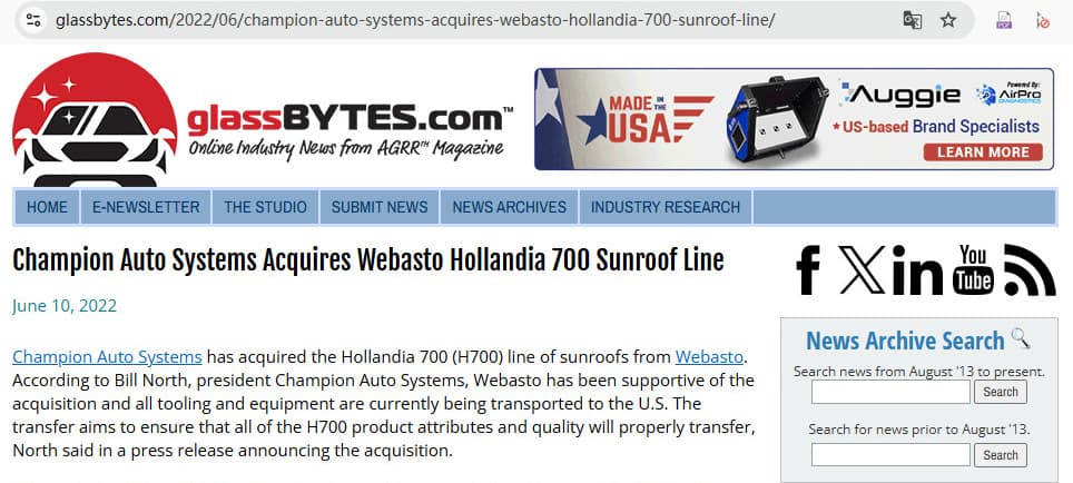 Strength Display: Champion Auto Systems Acquires the Entire Hollandia 700 Sunroof Line From Webasto.